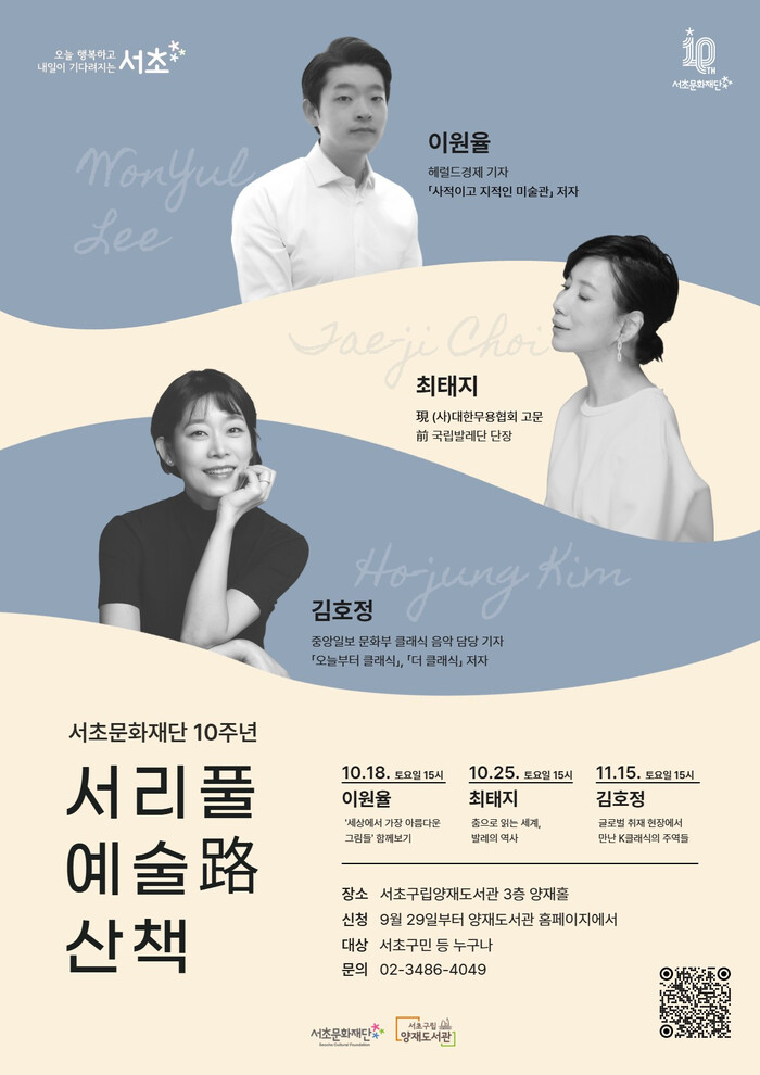 강은경 서초문화재단 대표이사는 “재단 창립 10주년을 맞아 도서관에서 펼쳐지는 다양한 문화예술 전문가 강연을 통해 서초가 글로벌 문화예술 미래도시로 거듭나길 바란다”고 말했다.