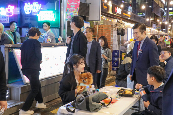 | ▲ 전성수 구청장(오른쪽)이 강남역 케미스트릿 페스티벌을 찾아 시민들과 소통하고 있다. (사진=서초구청 제공) |