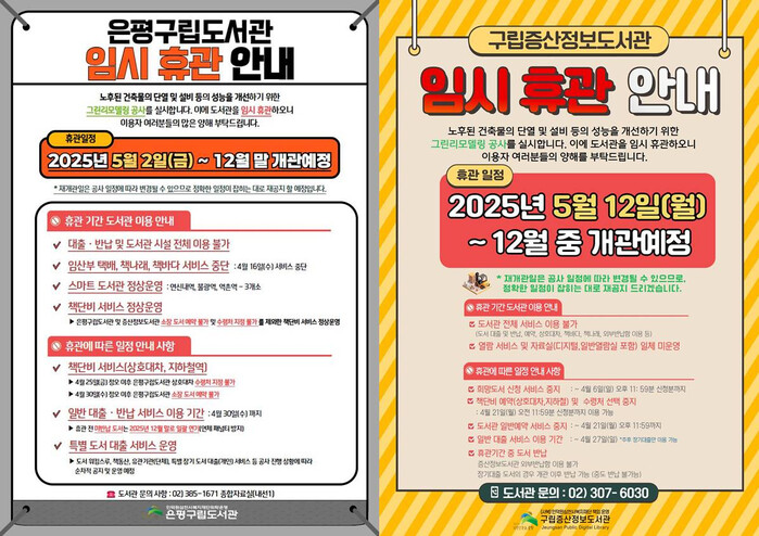 은평구립도서관은 내달 2일부터, 증산정보도서관은 내달 12일부터 각각 공사에 들어가며, 벽체 단열, 창호 교체, 냉난방기 및 환기장치 개선을 통해 에너지 효율성을 높일 계획이다.