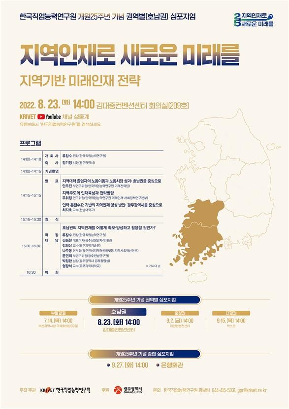 한국직업능력연구원은 우리 사회 최대 현안인 지역균형발전을 적극 지원하기 위해 ‘지역 인재로 새로운 미래를’이란 슬로건 아래 지역기반의 미래인재 전략을 주제로 광역권별로 순회하는 심포지엄을 기획했으며, 이번에 호남 지역에서 그 행사를 열게 된다.