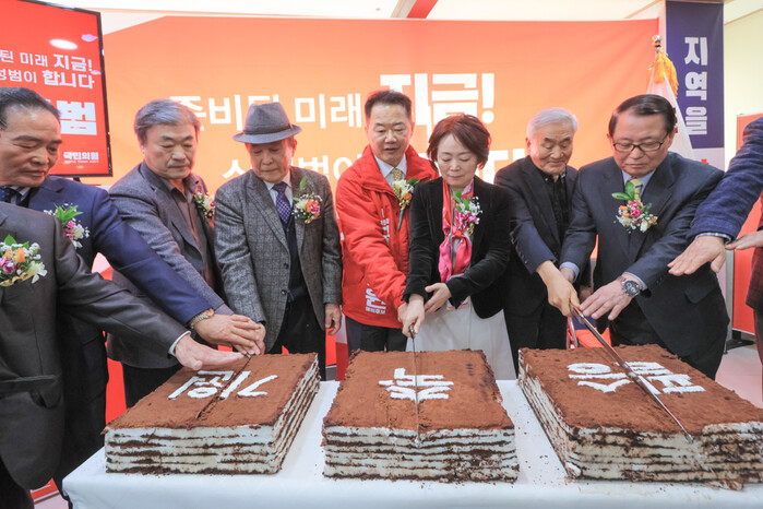 개소식 행사는 개회선언을 시작으로 국민의례, 내빈소개, 케이크 커팅, 격려사, 축하영상 시청, 예비후보 인사말, 필승삼창, 사진촬영 순으로 이어졌다.