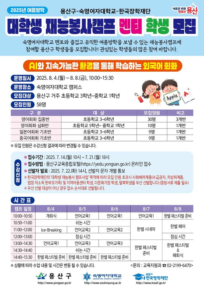 한국장학재단이 주관하고 용산구와 숙명여자대학교가 협력하여 진행하는 이번 캠프는 오는 8월 4일부터 8일까지 5일간 숙명여대 캠퍼스에서 열리며, 초등학교 3학년부터 중학교 1학년까지 총 58명이 참여한다.