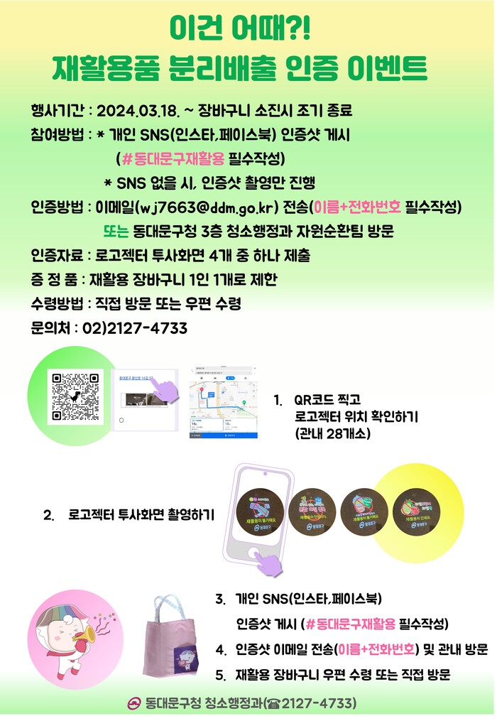 참여 상품인 재활용 장바구니는 우편으로 수령할 수 있으며, 개인 SNS 계정이 없는 구민은 동대문구청 3층 청소행정과로 방문해 촬영 사진을 보여주면 장바구니를 받을 수 있다.