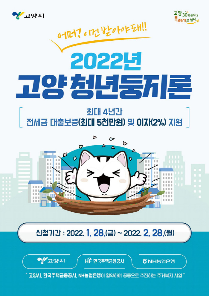 지원대상은 고양시 만 19세~39세 무주택 청년가구 세대주로, 5천만 원이내의 대출보증 및 연 이자 2%(연 100만원 한도)를 지원한다.