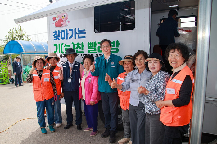 지난해 12월에는 삼호읍 한마음회관에 ‘기찬빨래방’이 개소했고, 올해 2월부터는 이동 세탁차량 ‘찾아가는 기찬빨래방’도 운영에 들어갔다. 찾아가는 세탁차량은 마을을 돌며 홀몸 노인들의 이불 세탁과 정리수납 서비스를 제공하며 노인 일자리 창출과 돌봄 강화라는 두 마리 토끼를 잡고 있다.