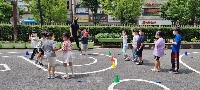 | ▲ ‘게임존’에서 아이들이 줄넘기·공놀이 등 다양한 게임을 하고 있다. (사진=강동구청 제공) |