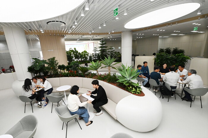 외관부터 제공되는 행정서비스까지 기존과는 완전히 다른 곳이다. 외형적으로는 마치 식물카페 같은 느낌을 풍긴다. 보통의 사무공간에 배치되는 딱딱한 칸막이 대신 곡선형 벽체에 식물을 심어 세련된 외관과 아늑한 내부 공간이 조화를 이룬 덕분이다.