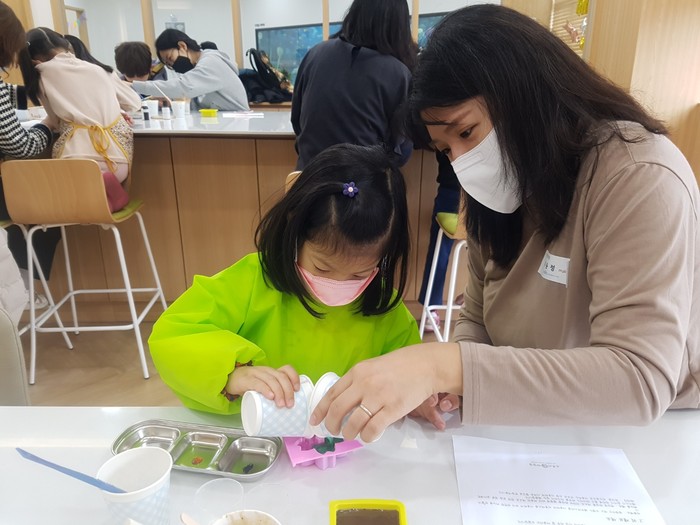 | ▲ 비누공예 프로그램에 참여한 한 아이가 비누를 만들고 있는 모습. (사진제공=마마플) |