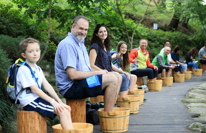 | ▲ '2017 산청한방약초축제'에 참가한 외국인 관광객들이 족욕체험을 하고 있다. (사진제공=산청군청) |
