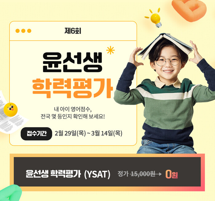 윤선생 학습회원이 아니어도 윤선생 학력평가에 응시할 수 있다. 윤선생 공식 홈페이지에서 3월 19일까지 학습상담을 신청하면 1만5천원 상당의 윤선생 학력평가 응시권이 무료로 제공된다.