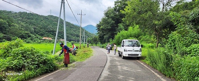29일 새벽 5시부터 마을 주민들 30여 명은 최근 집중호우로 무성해진 도로변 풀과 배수로 수초 제거, 쓰레기 수거와 재활용품 분리수거 작업을 했다. 구순의 어르신도 동참한 가운데 마을 초입부터 안길까지 구역을 정해 풀베기에 구슬땀을 흘렸다.