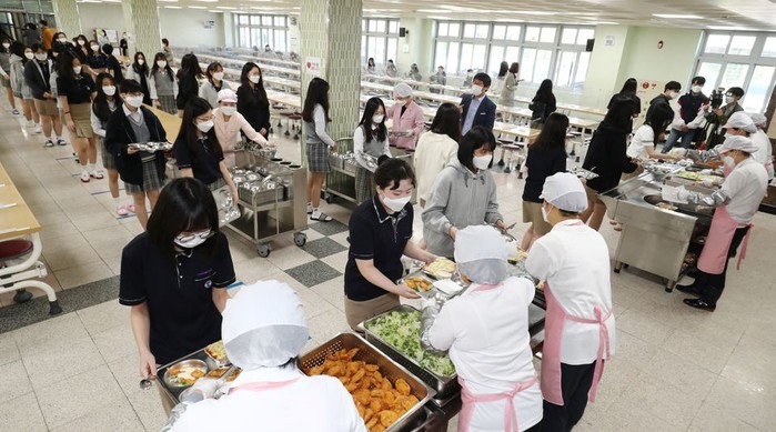 | ▲ 김포시 어느 한 고등학교 급식실에서 학생들이 배식을 받고 있다. (사진제공=김포시청) |