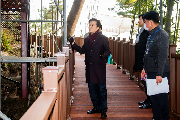 조규일 진주시장은 지난 7일 진양호 수변 숲길을 따라 쾌적하고 안전한 산책로 조성을 위한 ‘진양호 노을전망 데크로드 조성사업’ 1구간 완료 현장을 점검했다.