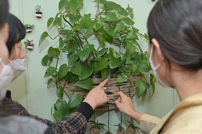 | ▲ 동화동 주민들이 폐 선풍기를 활용해 만든 화분을 감상하고 있다.(사진제공=중구청) |