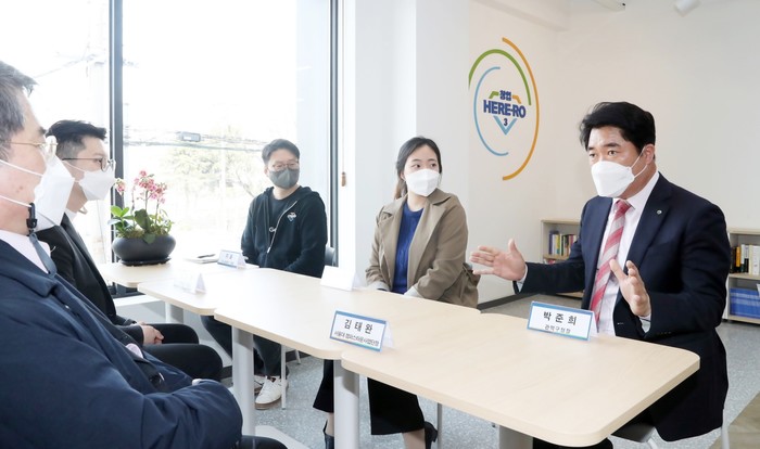 | ▲ 박준희 구청장(맨 오른쪽)이 2021년 3월 '창업 HERE-RO 3' 시설을 방문해 입주기업 관계자들과 이야기를 나누고 있다. (사진제공=관악구청) |
