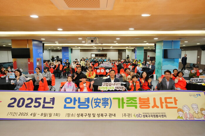 [시민일보 = 문민호 기자] 성북구(구청장 이승로)가 지난 4월 26일, 성북구청 지하 1층 다목적홀에서 『2025년 안녕가족봉사단 발대식』을 성황리에 개최했다. 이번 발대식에는 총 30가족 80여 명이 참여하여, 가족봉사단 오리엔테이션과 탄소사냥꾼과 함께하는 ‘탄소 이야기’ 프로그램을 진행하며 기후위기에 대한 인식을 제고하는 시간을 가졌다.