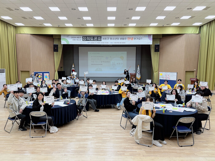 50여명의 청소년이 구청 강당에 모여 ‘서초구 청소년의 생활은 안녕한가요?’라는 주제로 구에 제안하고 싶은 정책에 대해 원탁토론을 진행했다.