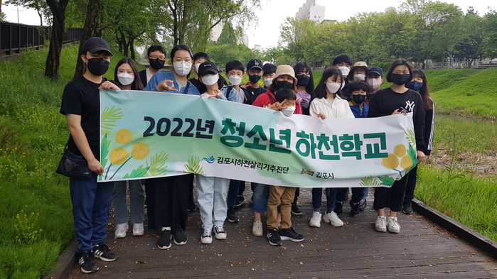 | ▲ 2022년 '청소년 하천학교' 프로그램에 참가한 학생들이 기념촬영을 하고 있다. (사진=김포시청 제공) |