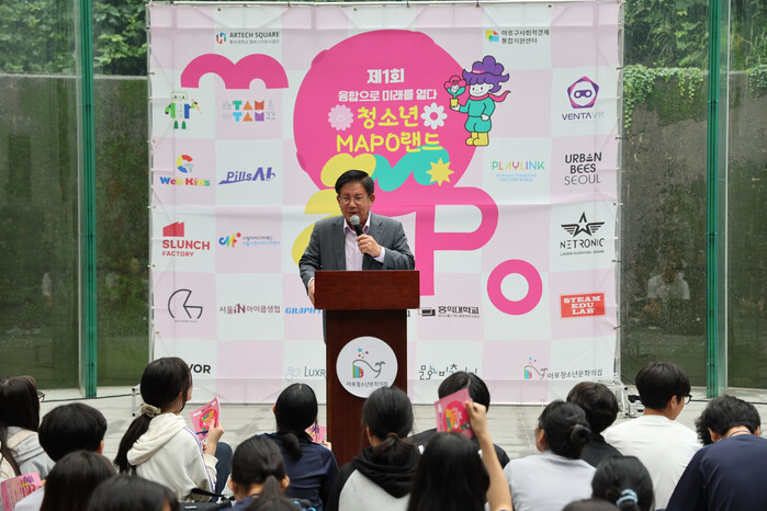 | ▲ 제1회 청소년 MAPO 랜드 축제에 참석해 학생들에게 인사말을 전하는 박강수 마포구청장. (사진=마포구청 제공) |