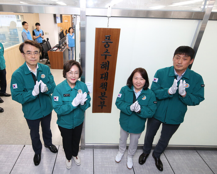 | ▲ 박희영 구청장(왼쪽 두 번째)이 '풍수해 재난안전대책본부' 개소식에서 현판식을 하고 있다. (사진=용산구청 제공) |