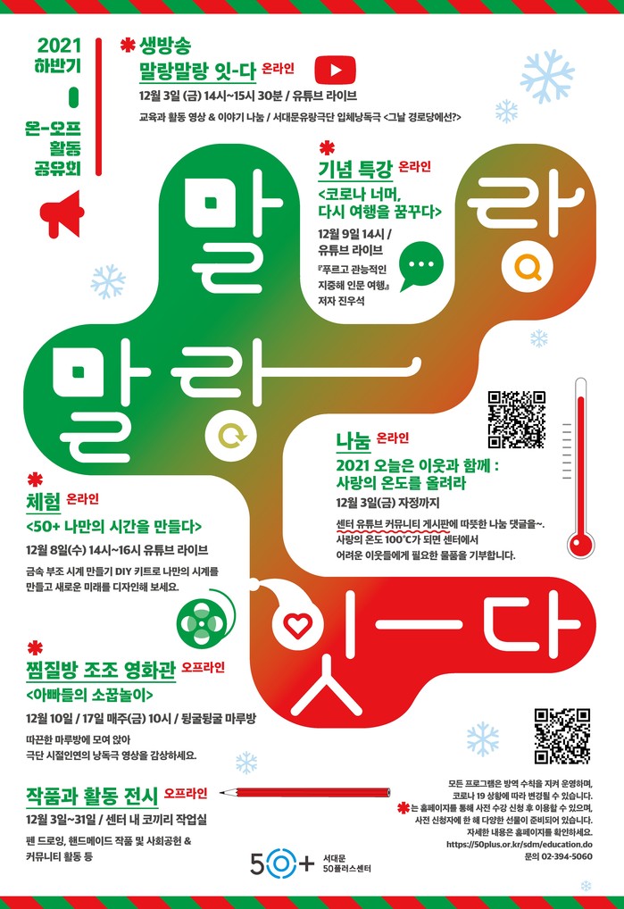 먼저, 생방송 말랑말랑 잇다는 ▲수강생과 강사들의 영상 편지 '배우고 익히는 즐거움' ▲올 한해 센터 활동을 결산하는 '서대문50플러스센터 2021어워드' ▲센터와 함께 활동한 이들의 대담 '내;일을 잇다' ▲서대문유랑극단의 '그날 경로당에선?' 공연으로 이뤄진다.