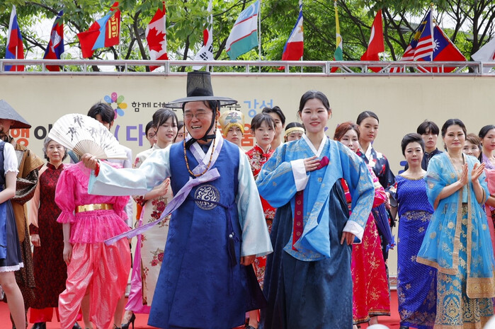 | ▲ 진교훈 서울 강서구청장(맨앞 왼쪽)이 24일(토) 화곡동 곰달래문화복지센터에서 열린 ‘제10회 다문화 축제 및 가족 행사’에서 한복을 차려 입고 ‘세계 전통 의상 패션쇼’에 올라 포즈를 취하고 있다. (사진=강서구청 제공) |
