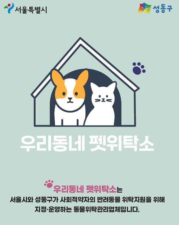 [시민일보 = 박소진 기자] 성동구(구청장 정원오)가 사회적 취약계층의 반려동물을 안전하게 위탁보호하는 ‘우리동네 펫위탁소’를 운영한다고 31일 밝혔다.