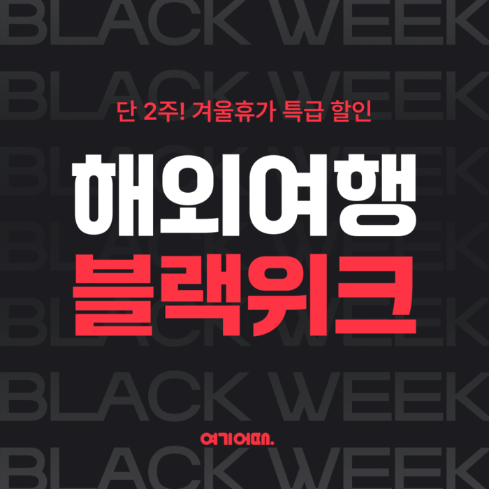 [시민일보 = 이대우 기자] 대한민국 대표 종합 여행·여가 플랫폼 여기어때(대표 정명훈)가 오는 14일까지 ▲해외숙소 ▲항공권 ▲항공+숙소 등 해외여행 상품을 대대적으로 할인하는 ‘해외여행 블랙위크’를 진행한다.