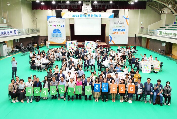 | ▲ 지난 6일 열린 2023 중랑비전 원탁회의에 참석한 류경기 구청장(앞줄 가운데) 및 참여자들이 기념촬영을 하고 있다. (사진=중랑구청 제공) |