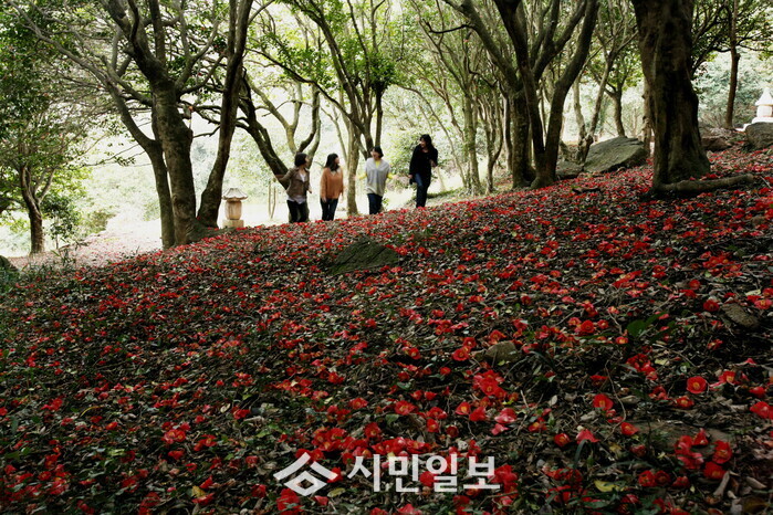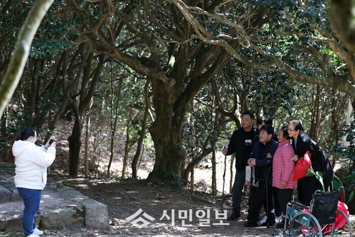 | ▲ 백련사 동백숲은 찾은 관광객 기념촬영 / 강진군 제공 |