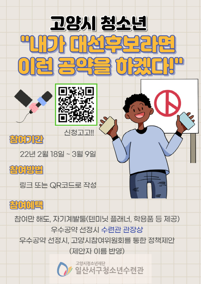 첫 번째 이벤트는 “내가 대선 후보라면, 이런 공약을 하겠다!”라는 주제로 정해진 양식에 국가와 지역사회에 필요한 공약을 작성하고, 선정된 공약은 고양시청소년참여위원회가 홍보 및 검토할 예정이다.