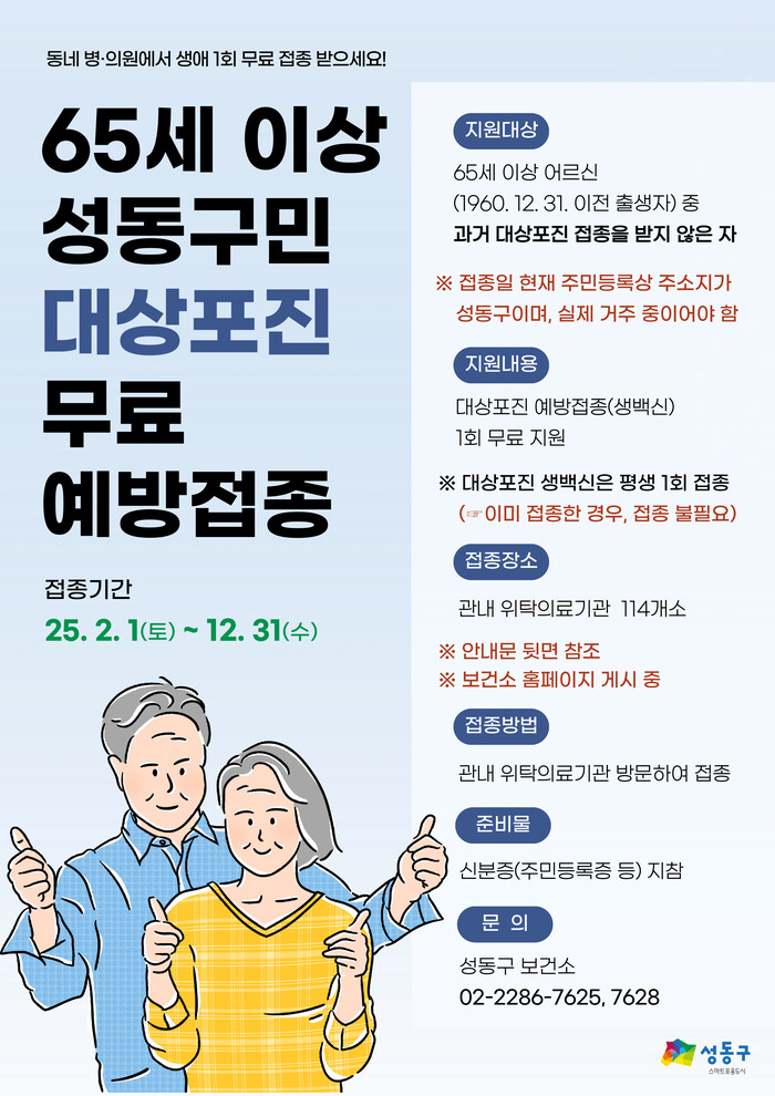 [시민일보 = 박소진 기자] 성동구(구청장 정원오)가 이달 1일부터 65세 이상 노인에게 대상포진 무료 예방접종을 실시한다.