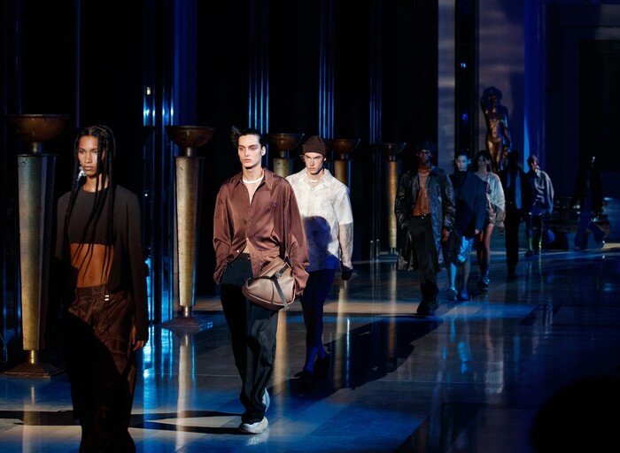 몸을 핏하게 감싸는 스쿠버 질레, 벨트, 바지 그리고 상의는 1980년대 여름 룩을 대표하며 이 아이템들은 여유로운 핏의 버튼업 베스트와 조화를 이루어 몸을 유영하는 듯 유려한 실루엣을 자랑한다.
