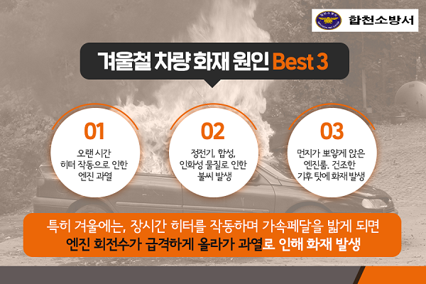 합천소방서에 따르면 겨울철 차량 화재는 추운 날씨 속 히터를 틀거나 가속페달을 밟아 생기는 엔진 과열, 기온 차로 손상된 피복에 의한 전선 노출 등으로 인한 원인이 주요 원인이다.