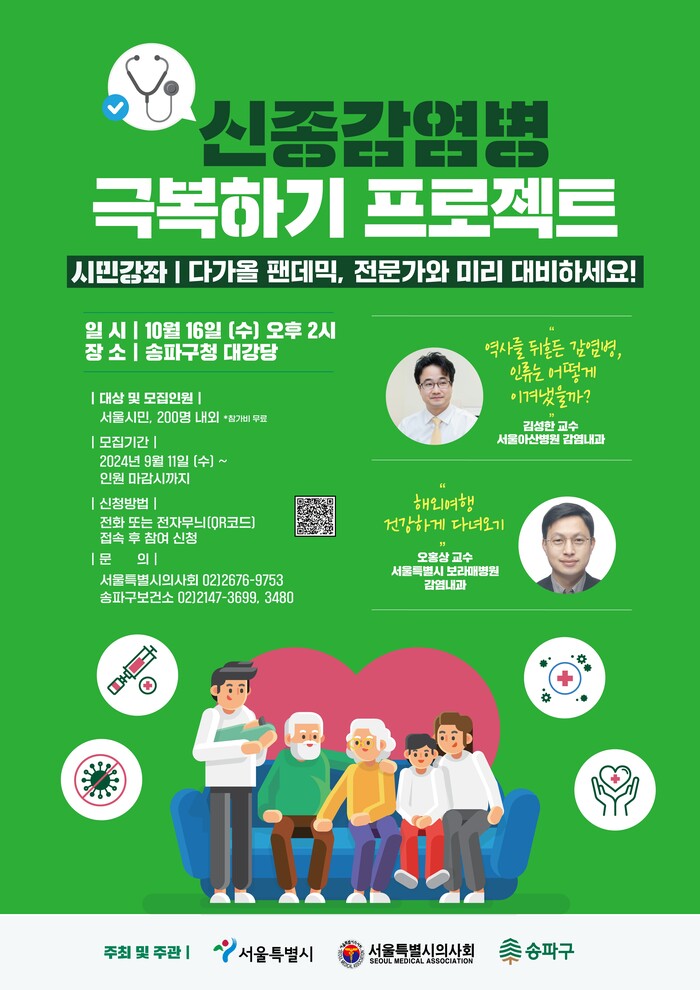 서울시와 서울시 의사회가 함께하는 이날 강좌에서는 신종감염병에 대비한 실질적인 정보를 전할 예정이다.