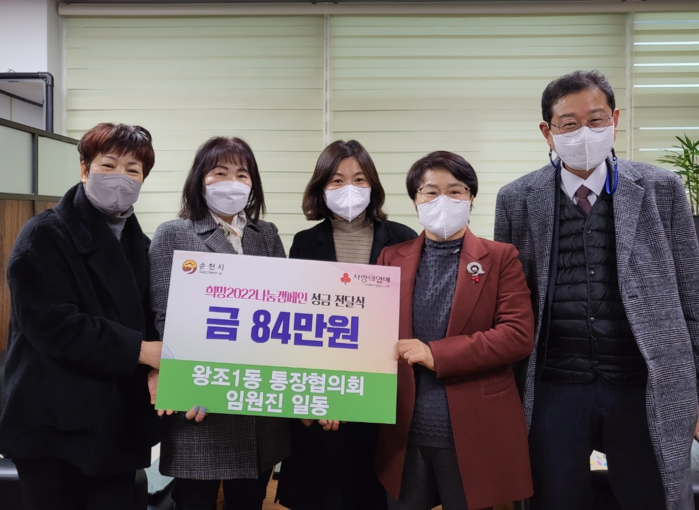 순천시 왕조1동 통장협의회(회장 박진숙) 임원들이 지난 13일 이웃돕기 성금 84만원을 기탁하며 희망2022나눔캠페인 기부행렬에 동참했다.