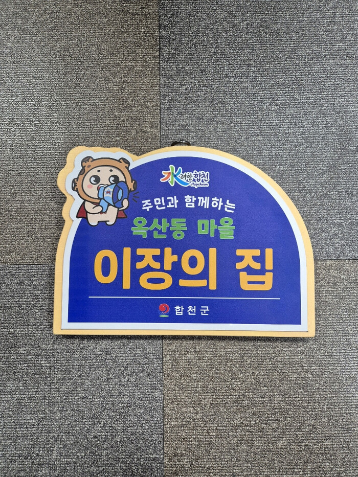 배부된 명패는 군민과의 소통 강화를 위해 개발된 친숙하고 정감있는 합천군 대표캐릭터인 ‘별쿵’이를 주인공으로 하였고, 마을 이장의 집을 쉽게 찾을 수 있도록 가로 32cm, 세로 24cm의 방무목과 알마이트 재질로 눈에 띄는 파란색으로 제작되었다.