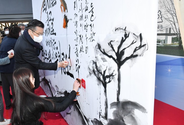 | ▲ 개관식에 참석한 류경기 구청장이 대붓 퍼포먼스를 하고 있다.(사진제공=중랑구청) |