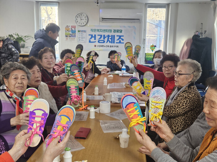 | ▲ ㈜하나투어 임직원이 제작한 치매 예방 컬러링 키트를 받은 사직동 어르신들의 모습. (사진=종로구청 제공) |
