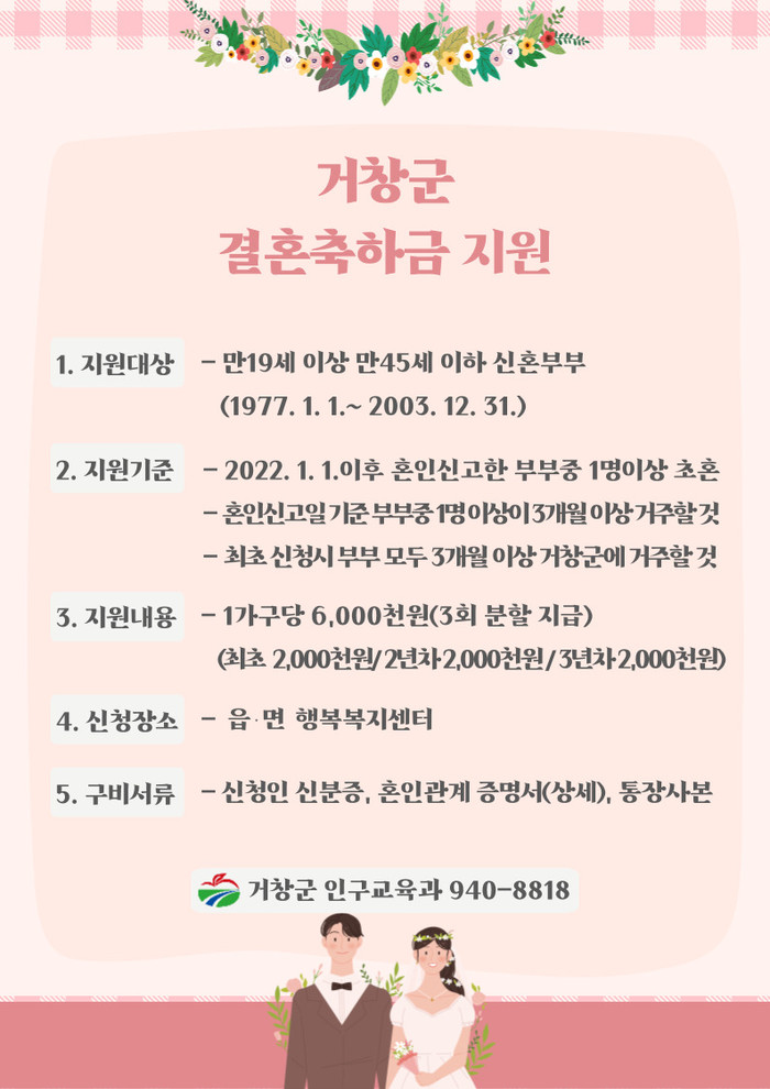 거창군은 지난 4일 청년 생활 안정 지원과 결혼 장려 분위기 조성을 위해 가구당 최대 600만 원의 결혼축하금을 지원한다고 밝혔다.