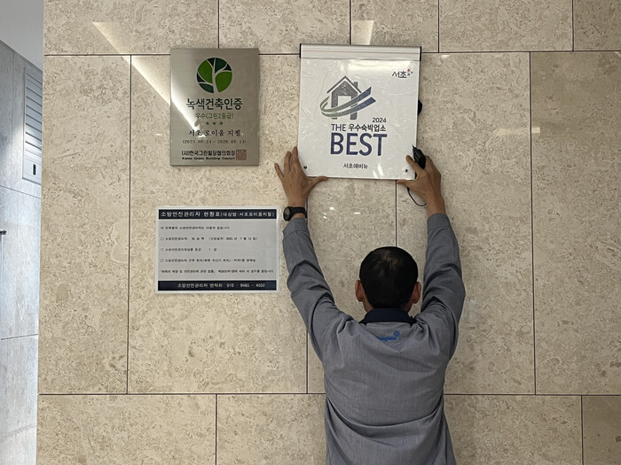 | ▲ ‘THE BEST 우수업소’ 표지판 부착 모습. (사진=서초구청 제공) |