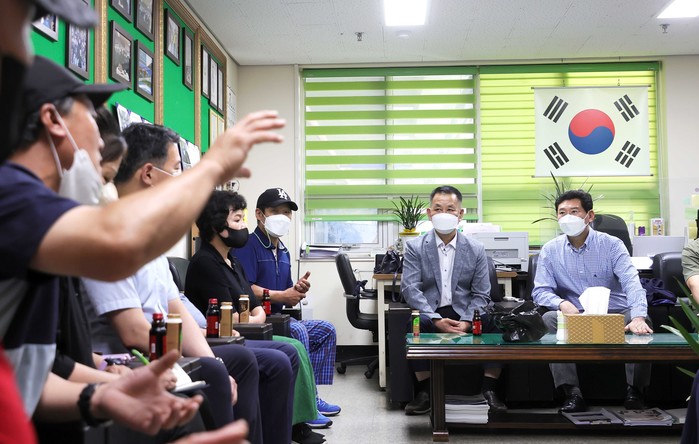 | ▲ 중앙시장 상인회를 방문한 이상일 용인특례시장(오른쪽)이 중앙시장 활성화에 대한 회원들의 제안을 경청하고 있다. (사진제공=용인시청) |
