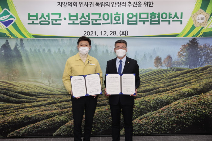 전남 보성군의회와 보성군은 28일 지방의회 인사권 독립에 따른 인사운영 등 업무 전반에 대해 협약을 체결했다. 이번 협약식은 지방자치법 전부개정에 따라 내년 1월13일자로 시행되는 지방의회 인사권 독립의 성공적인 안착과 효율적인 운영을 위해 마련됐다. 사진은 김재철 의장(오른쪽)과 김철우 군수(왼쪽)가 협약서를 들고 기념촬영을 하는 모습. (사진제공=보성군의회)