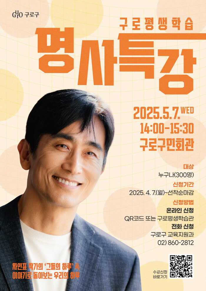 [시민일보 = 박소진 기자] 구로구(구청장 장인홍)가 오는 5월7일 구로구민회관에서 ‘구로평생학습 명사 특강’을 개최한다고 4일 밝혔다.