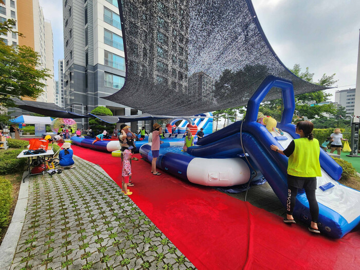 옥수파크힐스 아파트 물놀이장에서는 유아 및 초등학생 자녀를 둔 입주민 가족이 참여해 시원한 물놀이 행사를 진행했으며 안전요원과 자원봉사자들이 배치되어 안전하고 쾌적한 환경 속에서 에어풀장, 워터슬라이드, 물총놀이존 등을 운영했다.
