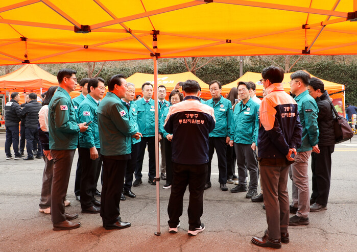서울 강동구의회가 25일 강동구 명일동에서 발생한 싱크홀(땅꺼짐) 사고 현장을 직접 찾아 상황을 점검하고, 신속한 복구와 재발 방지를 위한 대책 마련에 나섰다. 사진은 현장에서 관계자의 설명을 듣고 있는 의원들의 모습. (사진=강동구의회 제공)