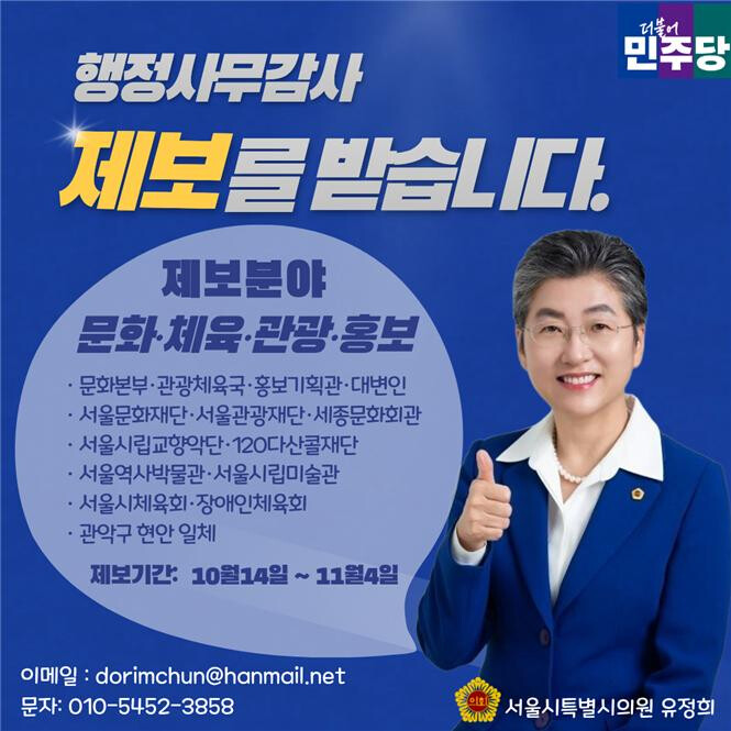 [시민일보 = 이대우 기자] 서울시의회 문화체육관광위원회 유정희 의원(관악4)이 오는 11월4일까지 시민 의견을 직접 접수받는 ‘행정사무감사 시민제보창구’를 운영한다.