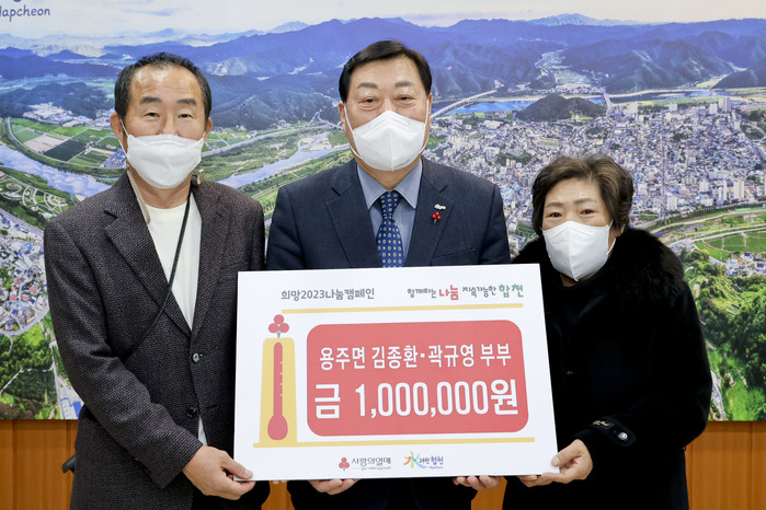 김윤철 합천군수는 “한해의 결실을 기부하는 것이 쉽지 않은 결정인데 어려운 이웃을 위해 기부해주셔서 감사드린다. 김종완, 곽규영 부부의 정성을 힘든 이웃들에게 잘 전달하겠다”고 말했다.