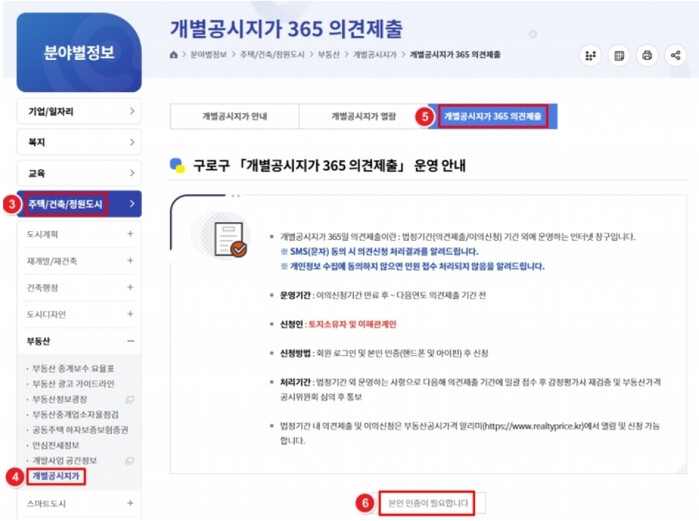 이번에 구축된 ‘개별공시지가 365 의견제출’은 구로구청 홈페이지(분야별정보→주택/건축/정원도시→부동산→개별공시지가)에서 접속할 수 있으며, 휴대전화 인증을 통해 간편하게 의견을 등록할 수 있다.