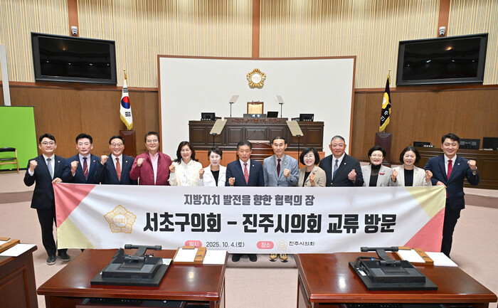 [시민일보 = 박소진 기자] 서울 서초구의회(의장 고선재) 의장단이 최근 경남 진주시를 방문해 지역 대표 축제인 ‘진주남강유등축제’의 성공적인 개최를 축하하고, 두 의회 간 교류 확대와 협력 방안을 논의했다.